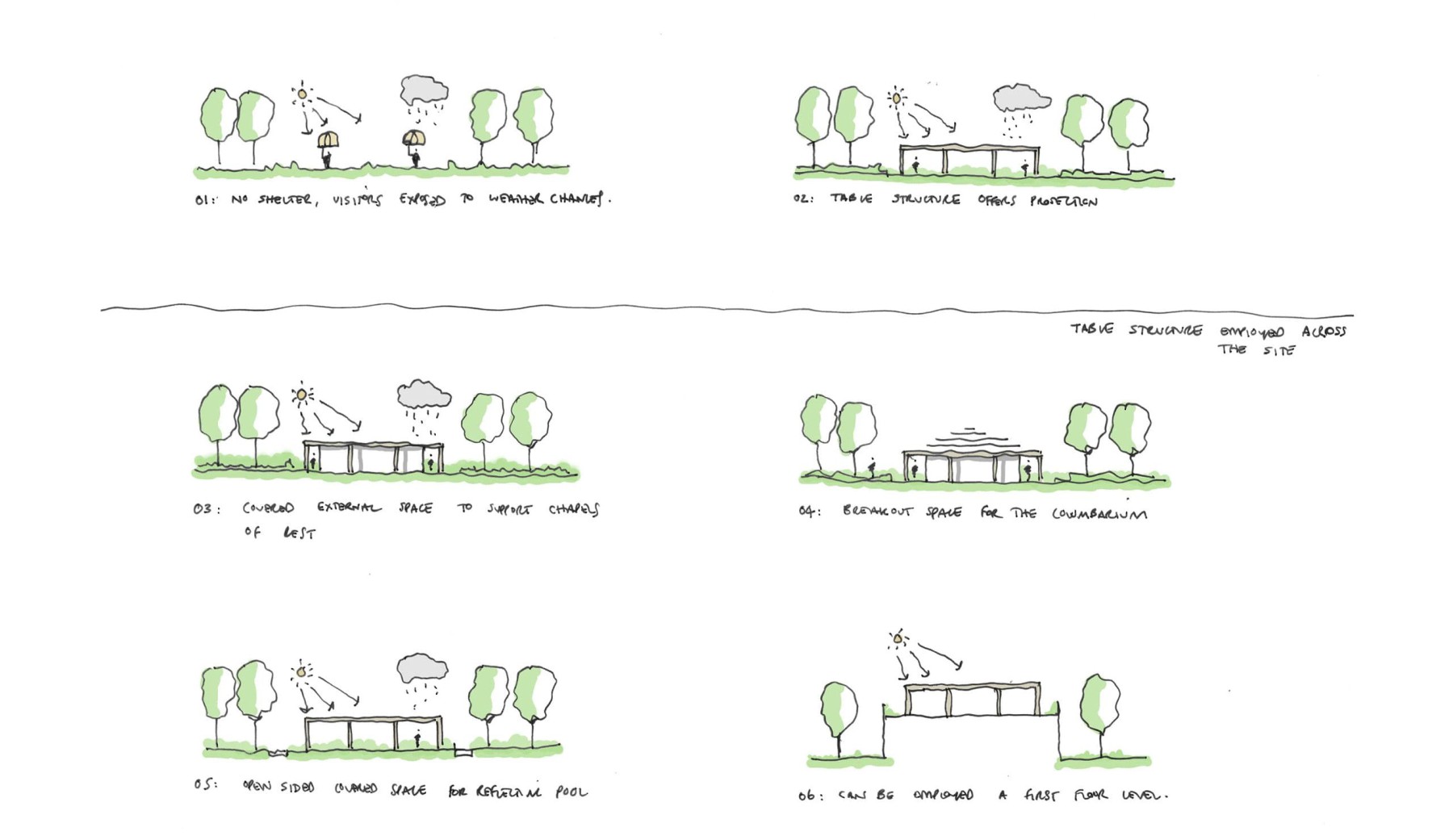 The design employs ‘table’ structures that provide covered spaces across the development. These structures are meant to give visitors and staff meaningful and sheltered places to pause and reflect. They add character to the Woodland Burial Complex and improve the overall experience for all who visit.