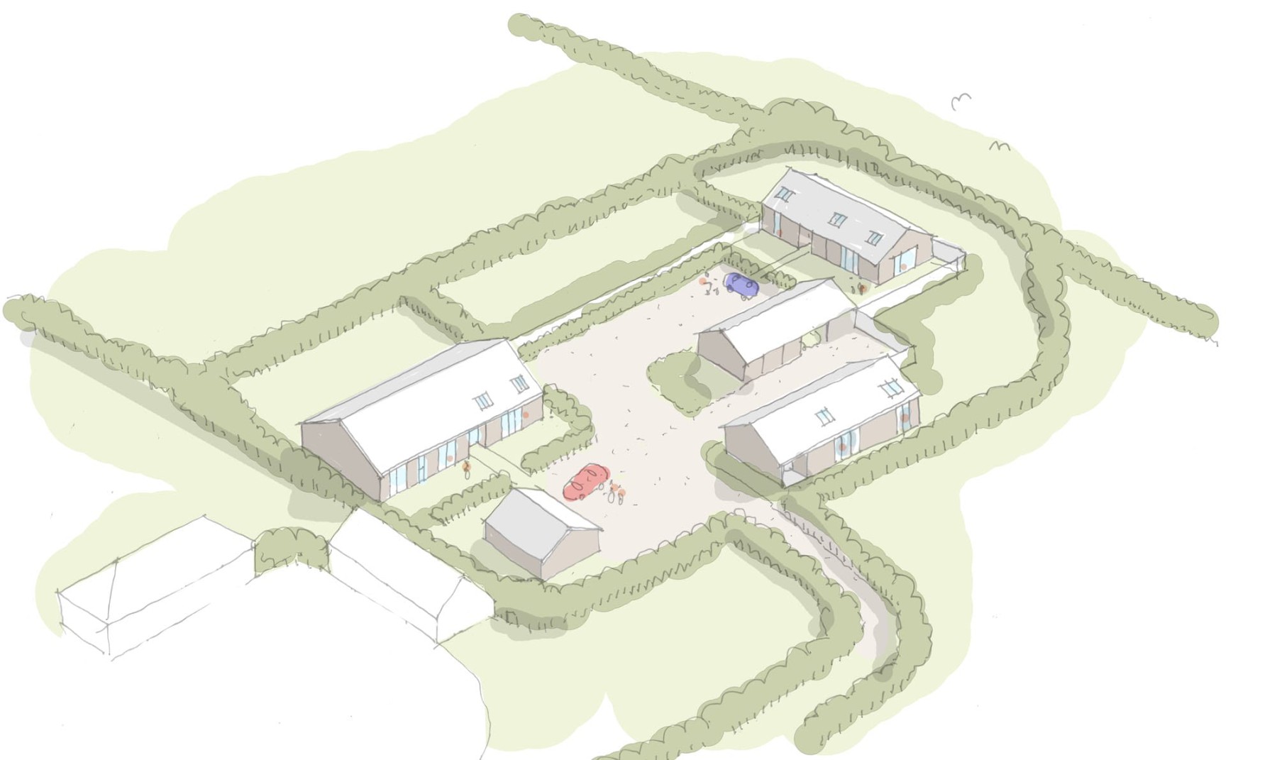 Phase 3 – A follow up application for full planning was submitted on the basis the the new buildings would represent an visual improvement on the converted structures. The application also included additional car barns and garages to serve the new units. This application has now been granted to the delight of our client, who can now proceed with a new build project without the restrictions of the Class Q conditions.