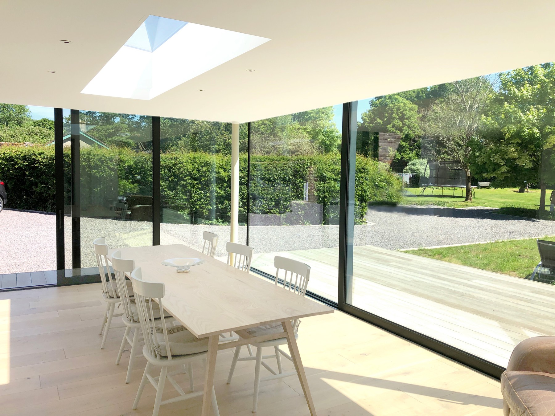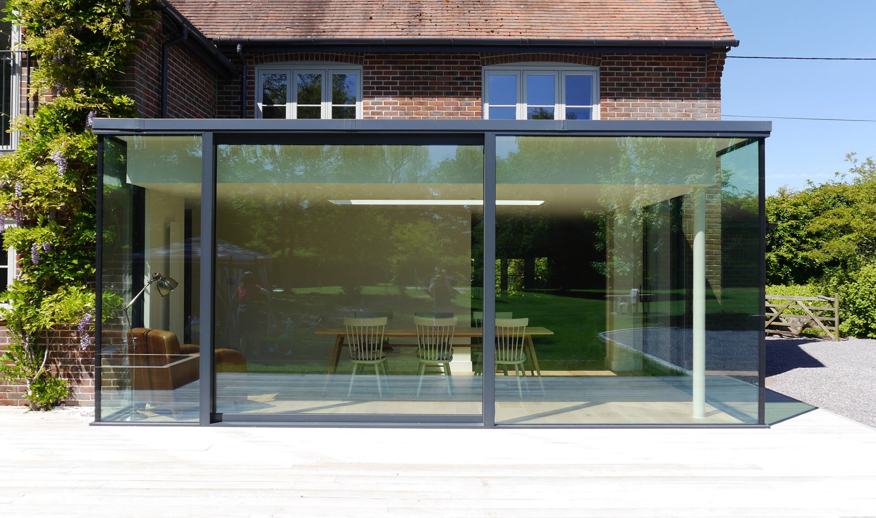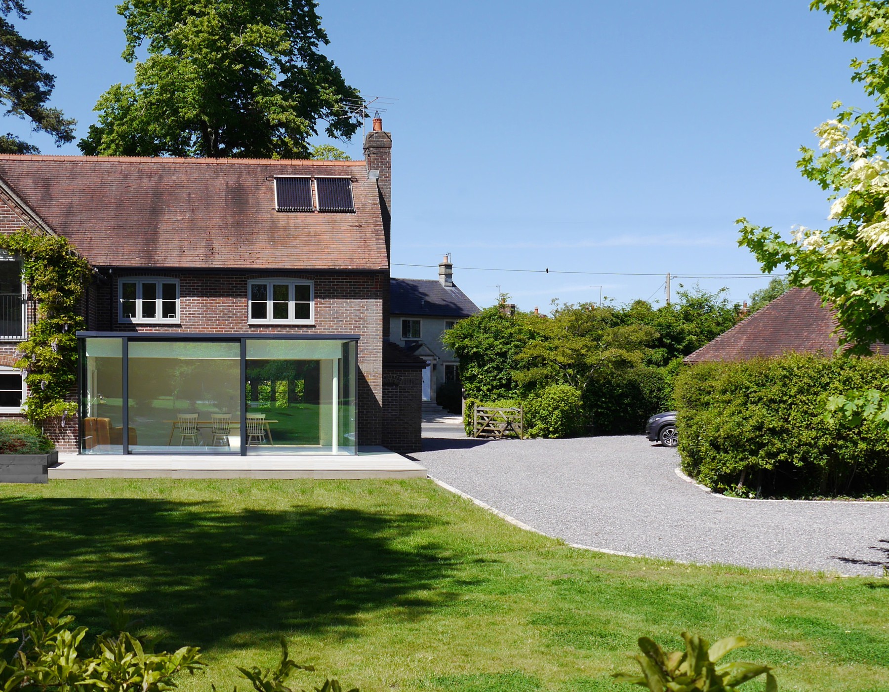 The brief called for a design which respectfully reinterpreted the farmhouse's original character, integrating it seamlessly with a modern addition. The principle challenge lay in replacing a tired conservatory with an extension that sits juxtaposed to the existing and which stretches out to unite inside and outside.