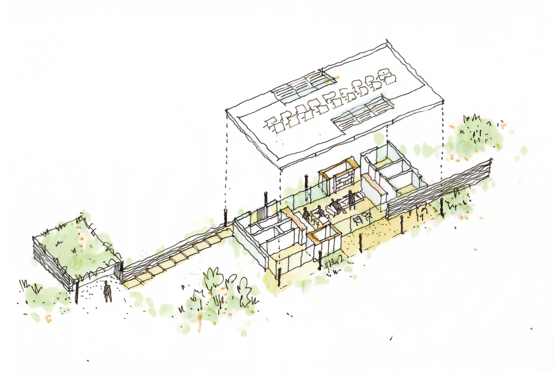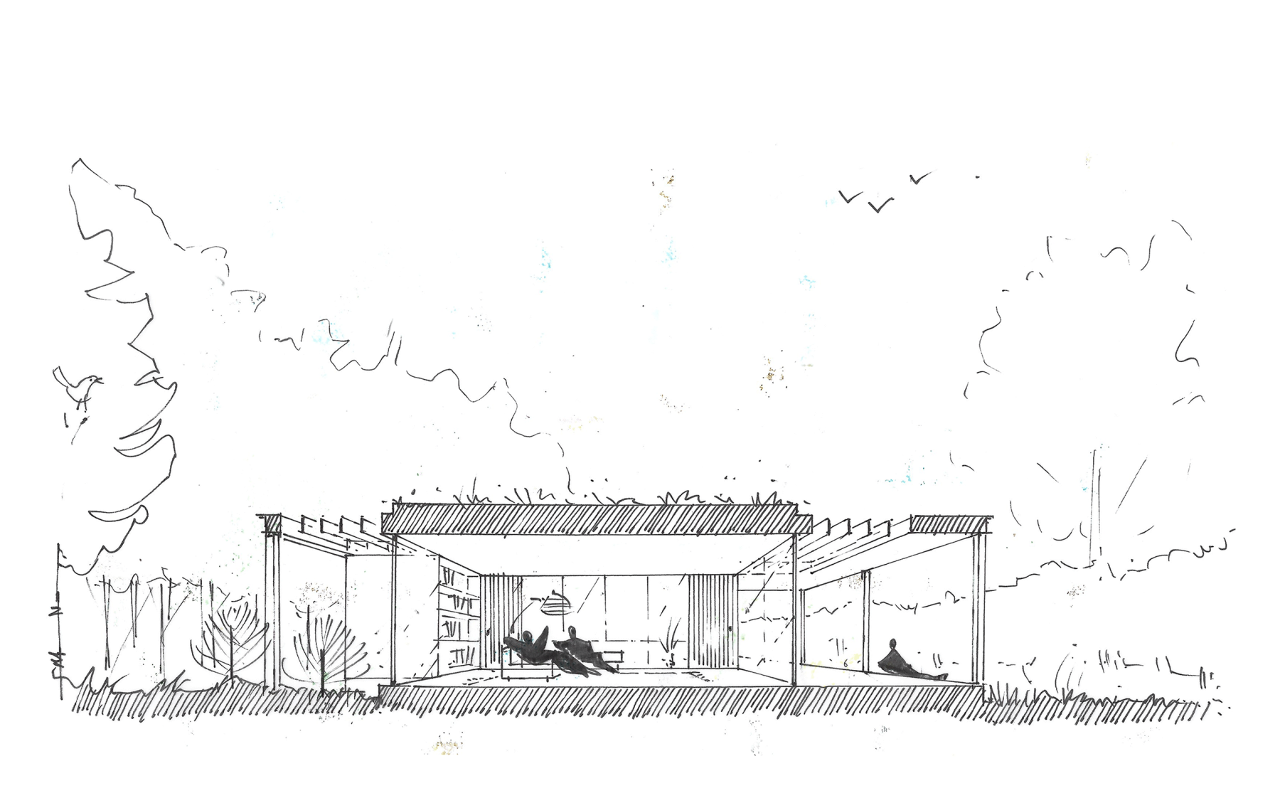 Linear walls guide movement, delineating private and shared spaces. Rising from the lower level, the walls stop above the door height, allowing top-lit slot windows to illuminate ancillary areas. A bronze-finished tabletop structure unifies the internal zones, providing solar shading and shelter to external spaces. Full height glazing is used to frame the private woodland views whilst drawing in natural light.