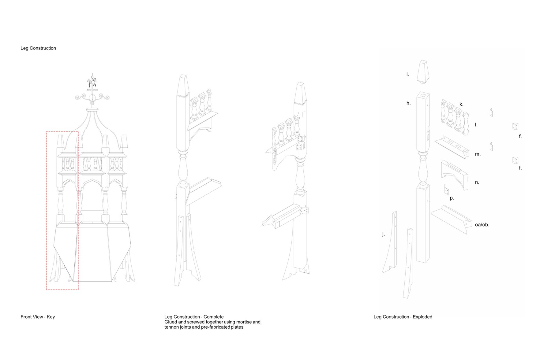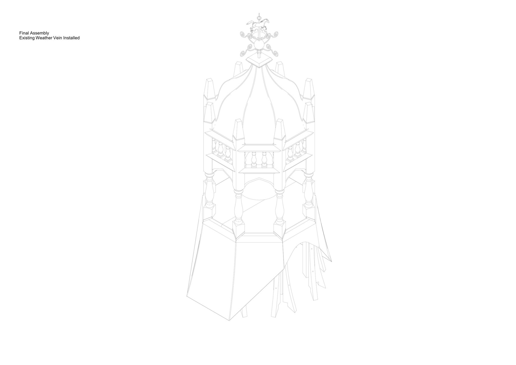 The once majestic bell tower atop the Jubilee Room (Historic England 1263540) had deteriorated over time. Its dismantled state, though fragmented, retained hints of its past beauty, evident in the turned balusters and carved arches. Leveraging our carpentry design proficiency and understanding of timber construction, we embarked on digital reproduction. This was akin to piecing together a historic puzzle.